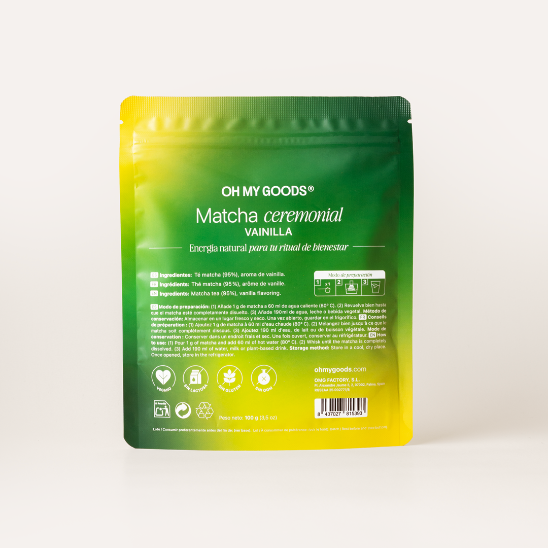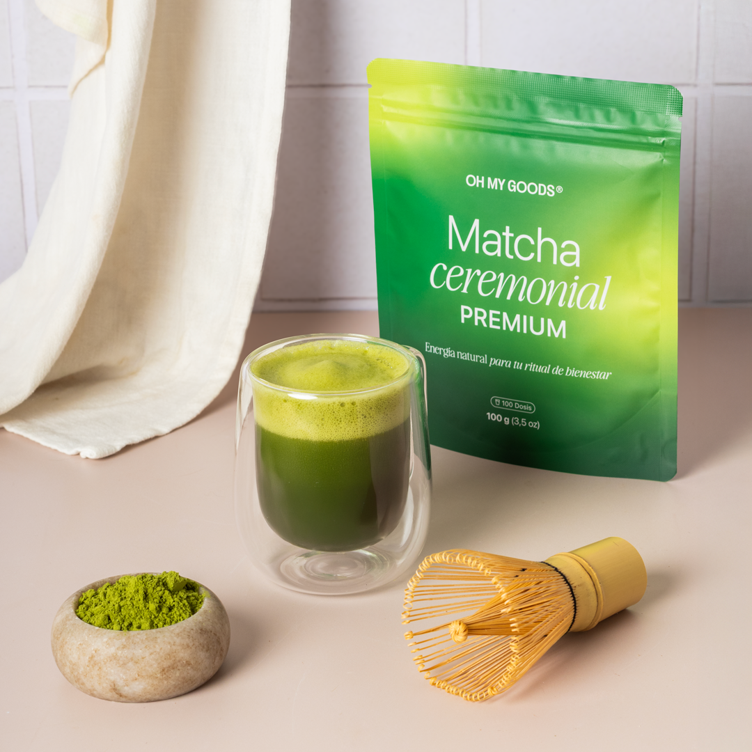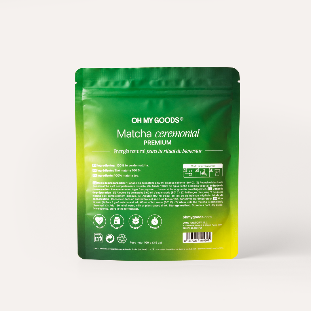 100 gramos de Té matcha Ceremonial Premium de la mejor calidad; sin colorantes, conservantes ni azúcar. Cuenta con una alta concentración de antioxidantes que ayudan a reducir el envejecimiento. Además, aporta energía sin picos de estrés gracias a la L-Teanina, lo que te ayuda a mantener tu energía a lo largo del día de la forma más natural.